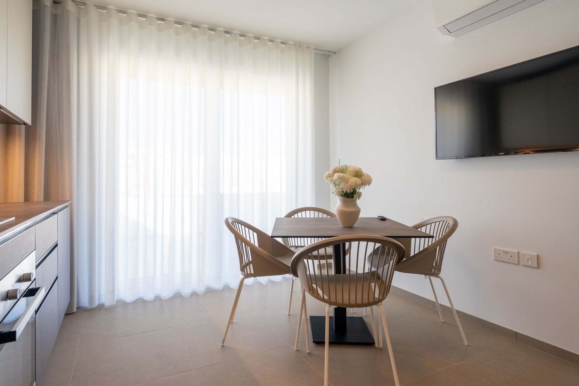 The King Studio is one of our most popular private rooms, measuring 30m2. This is a private suite with minimalist design, which includes a double bed, kitchenette, and private balcony. The room is cleaned with extra care to protect vulnerable guests such as babies and allergic people. All common zones are always thoroughly sanitised. The room has soundproof windows with double glazing, a fully equipped kitchenette with a hob, oven, fridge, and sink, as well as a small dining table, and the silent air conditioner. The bed feature memory foams mattresses and pillows, for a comfortable rest. All furniture has been tailor-made crafted to high quality. A linear design guaranteeing maximum cleanliness, combined with warm wood to create a cosy and comfortable setting. A free cable TV on a 43-inch TV and radio and complimentary Wi-Fi are available. The room includes daily housekeeping, linen and fresh towels are included. While staying here, you will also be able to make use of the rooftop insulated pool to help you unwind after a day of exploring the Maltese islands. Other optional services include laundry, airport transfer and ironing.